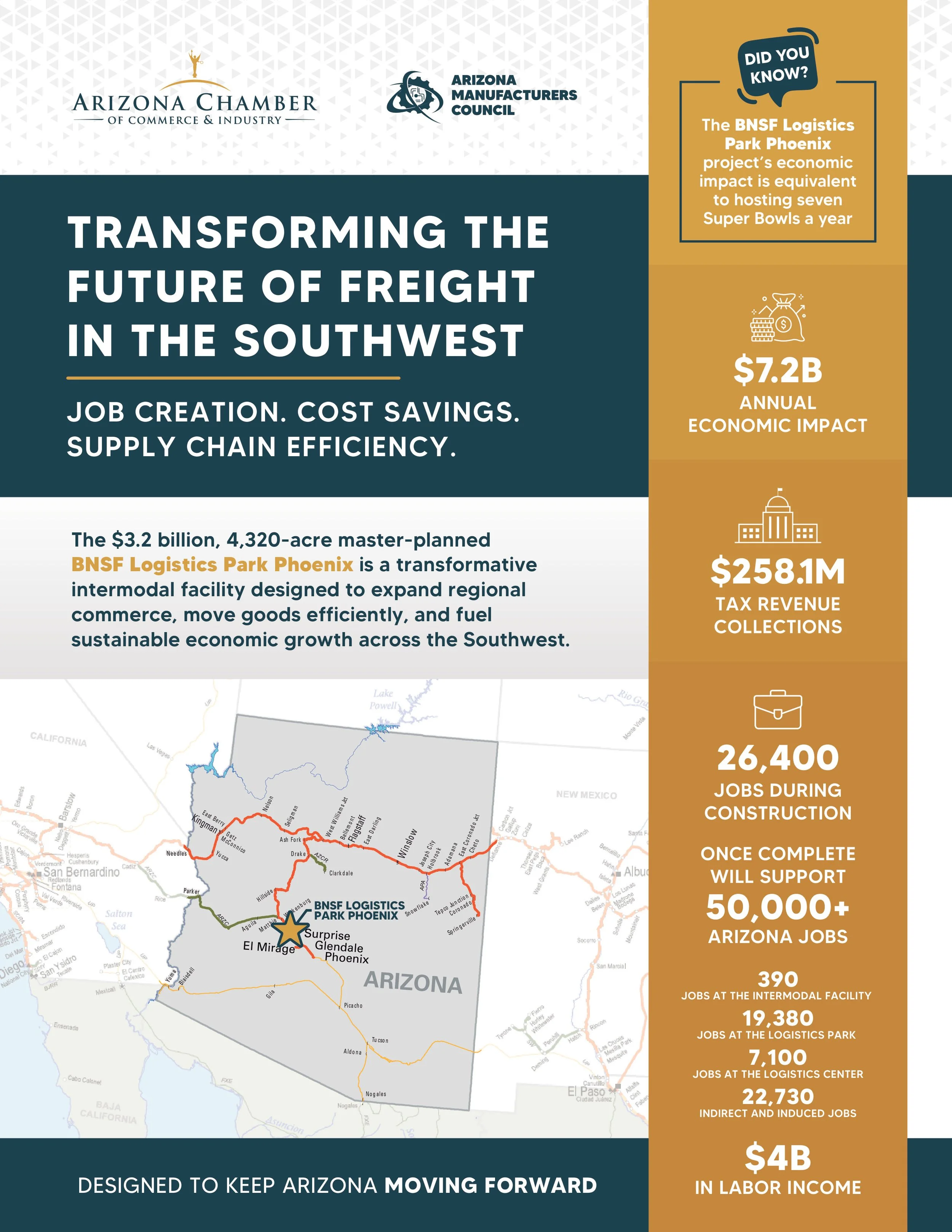 The scale of the benefits is transformative: 76,000 direct and indirect jobs, $4 billion in labor income, and $258 million in annual tax revenue to fund local schools, colleges, and infrastructure. This project ensures Arizona can meet the demands of a rapidly growing population and a modern, interconnected economy.